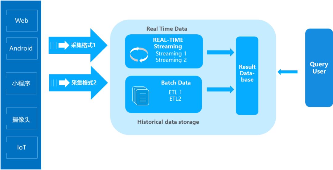 ● Ad-hoc即时查询:鉴于整体的计算流程机制,在手机端、智能IOT事件发生之时,就可以直接传送到云端进入real time data区,可以被前端的Query Engine来查询。此时用户可以使用各种各样的查询,直接查到前几秒发生的事件,而不用在等待ETL或者Streaming的数据研发和处理。